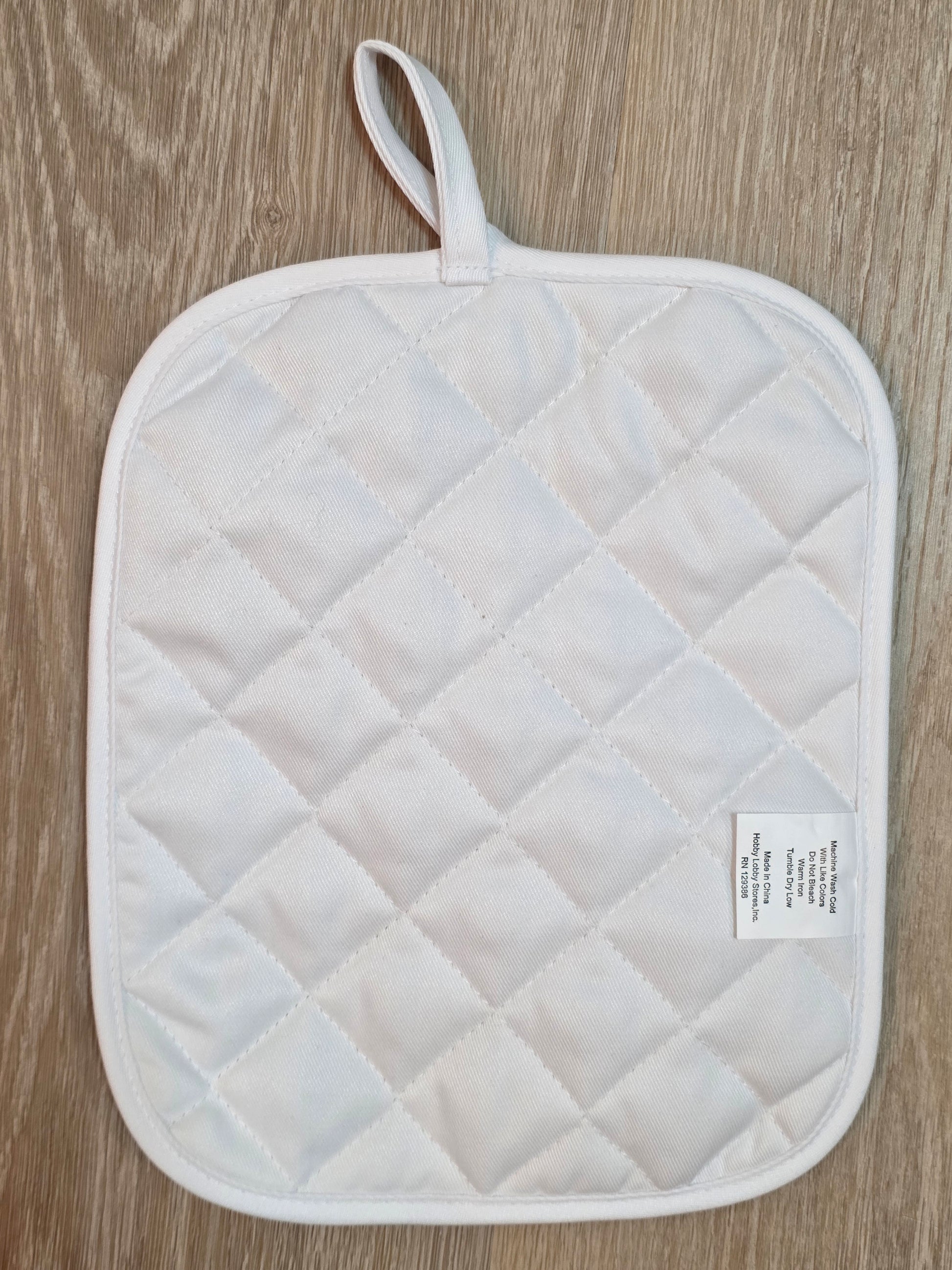 The pot holder features a quilted texture on one side and smooth pocket side for your hand and a loop for hanging when not in use.